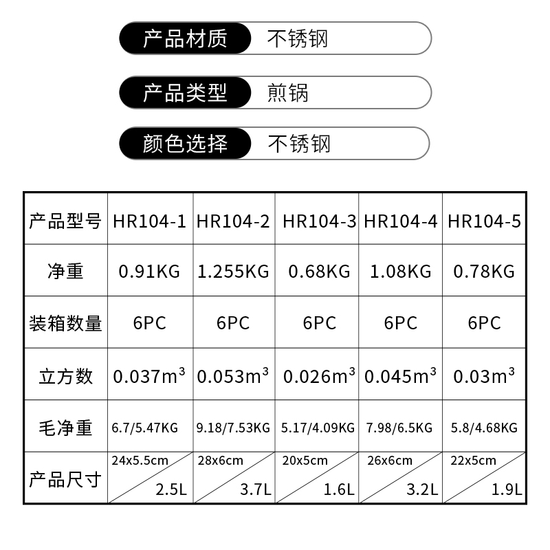 类型:不锈钢煎盘 材料:不锈钢 认证:LFGB,CIQ,SGS 产地:中国广东 型号:GS-01284(HR104) 尺寸:20/22/24/26/28CM 盖子:无盖 底部:复底 起订量:1200套