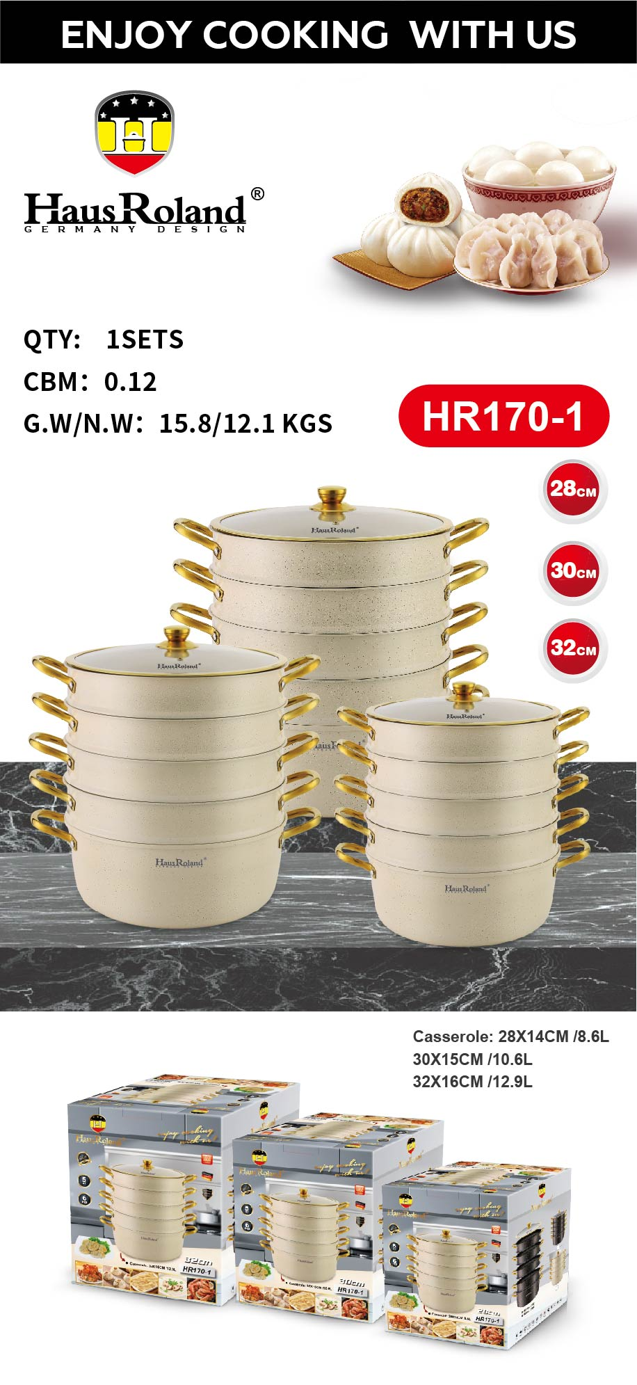 锅身:不锈钢201,0.35mm厚 底部:复底,1.2mm 铁,有底唛 外部处理:喷漆撒点 内部处理:喷不粘漆 盖子:G型玻璃盖,盖圈镀金色 配件:不锈钢通手柄和盖滴镀金色