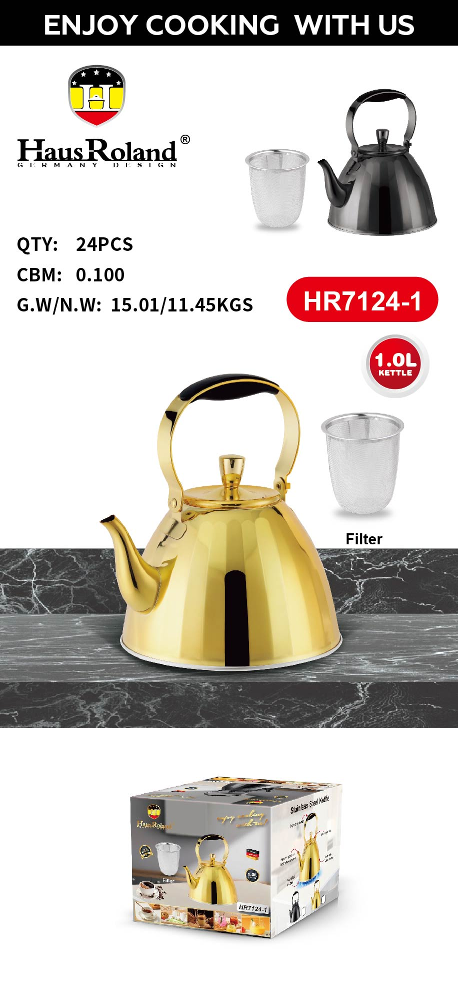 壶身:不锈钢201,0.4mm, 有壶身logo,有茶漏 底部:0.5mm铝+1.5mm铁+0.5mm铝,430包底,内底镜光,有底唛 外部处理:镀金 内部处理:砂光 盖子:不锈钢盖镀金 配件:不锈钢线手柄镀金加黑色硅胶