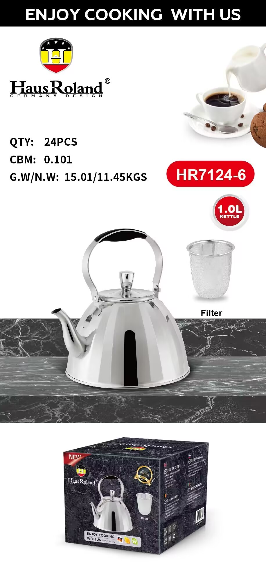 壶身:不锈钢201,0.4mm, 有壶身logo,有滤网 底部:0.5mm铝+1.5mm铁+0.5mm铝,430包底,内底镜光,有底唛 外部处理:镜光 内部处理:砂光 盖子:不锈钢盖 配件:不锈钢线手柄加黑色硅胶