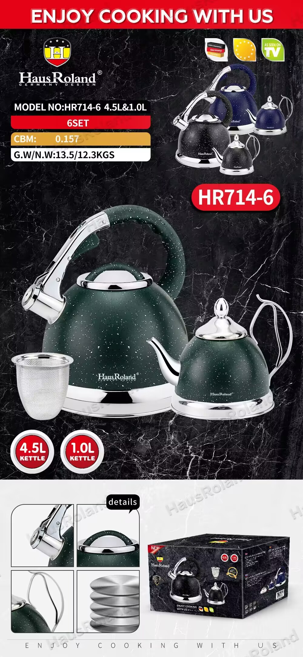 壶身:不锈钢201,0.4mm,带茶漏 底部:底部直径24cm,复底0.5mm铝+1.5mm铁+0.5mm 铝,43大包底,有底唛,壶身带logo,内底镜光 外部处理:上喷底漆+两色撒点漆,下镜光 内部处理:砂光 盖子:不锈钢盖+尼龙喷漆 配件:锌合金手柄加尼龙手柄,尼龙部分喷漆同壶身一样