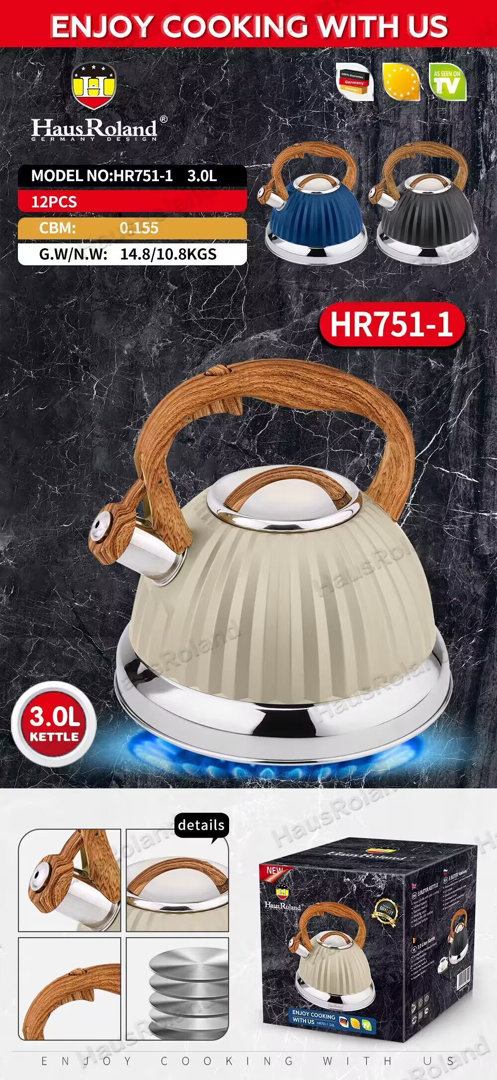 壶身:高壶身,不锈钢201,0.4mm 底部:0.5mm铝+1.5mm铁+0.5mm铝,430包底,内底镜光 外部处理:上喷漆,下镜光 内部处理:砂光 盖子:不锈钢盖,如图 配件:尼龙手柄和盖滴喷木纹手感漆