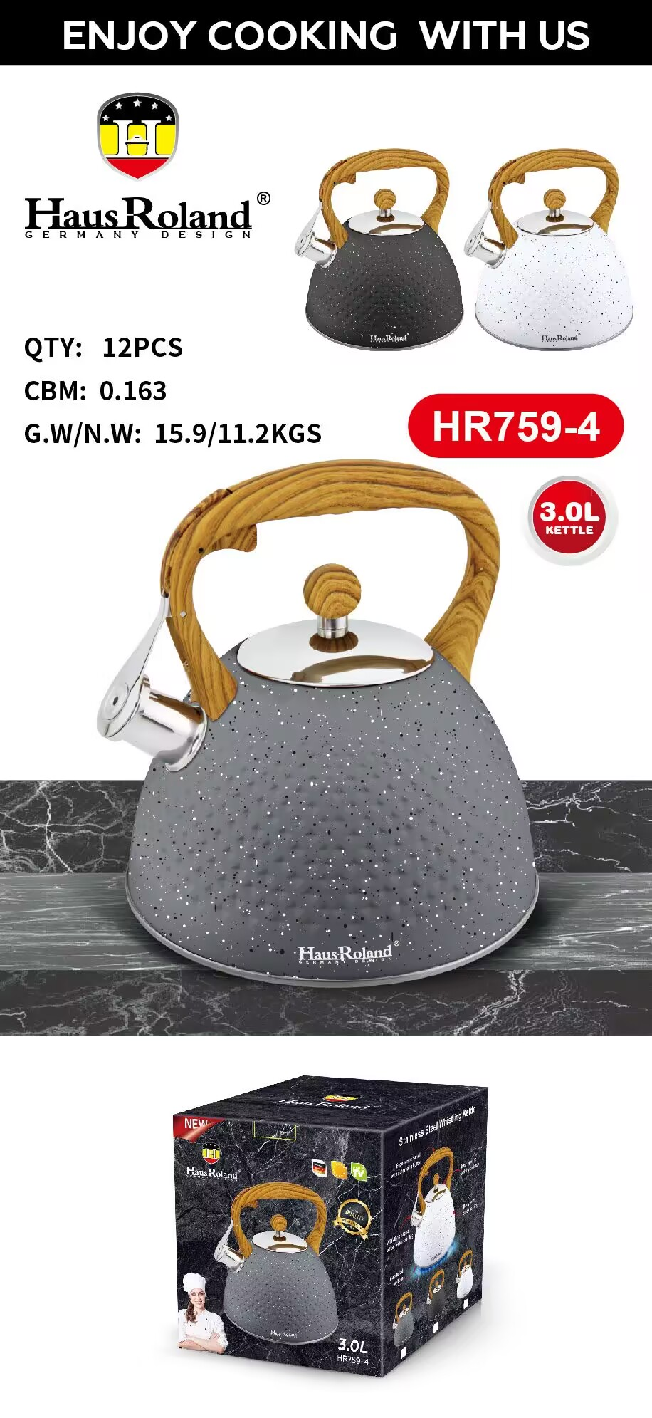 壶身:不锈钢201,0.4mm厚度, 底部:0.5mm铝+1.5mm 铁+0.5mm 铝,430包底,有底唛 外部处理:喷漆 内部处理:砂光 盖子:不锈钢盖 配件:尼龙手柄喷木纹手感漆