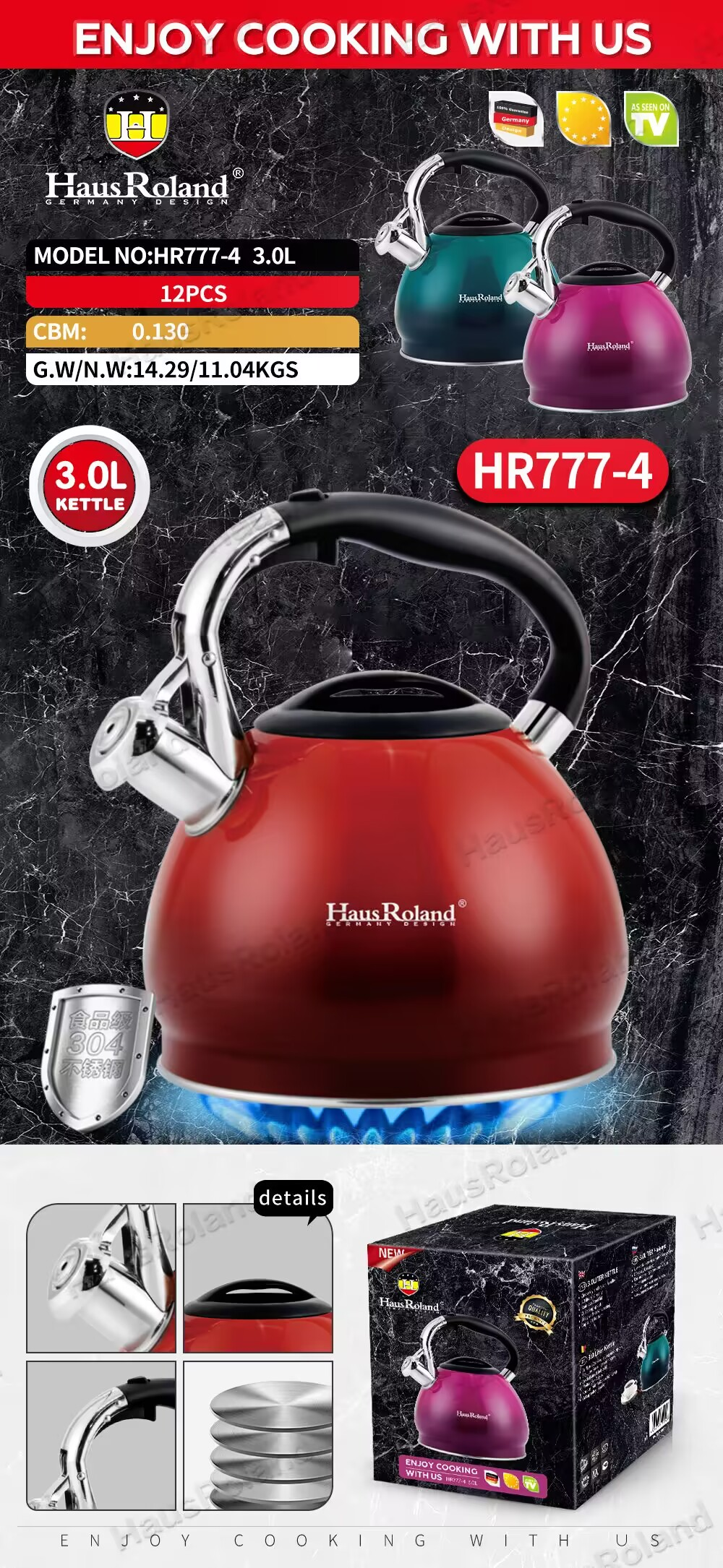 壶身:不锈钢304,0.4mm 底部:0.5mm铝+1.0mm铁+0.5mm铝,430包底 外部处理:喷渐变高温漆 内部处理:砂光 盖子:不锈钢盖 配件:锌合金手柄+尼龙手柄喷黑色硅胶手感漆 盖子:不锈钢盖喷黑色硅胶手感漆 备注:壶嘴,壶盖,内底304料