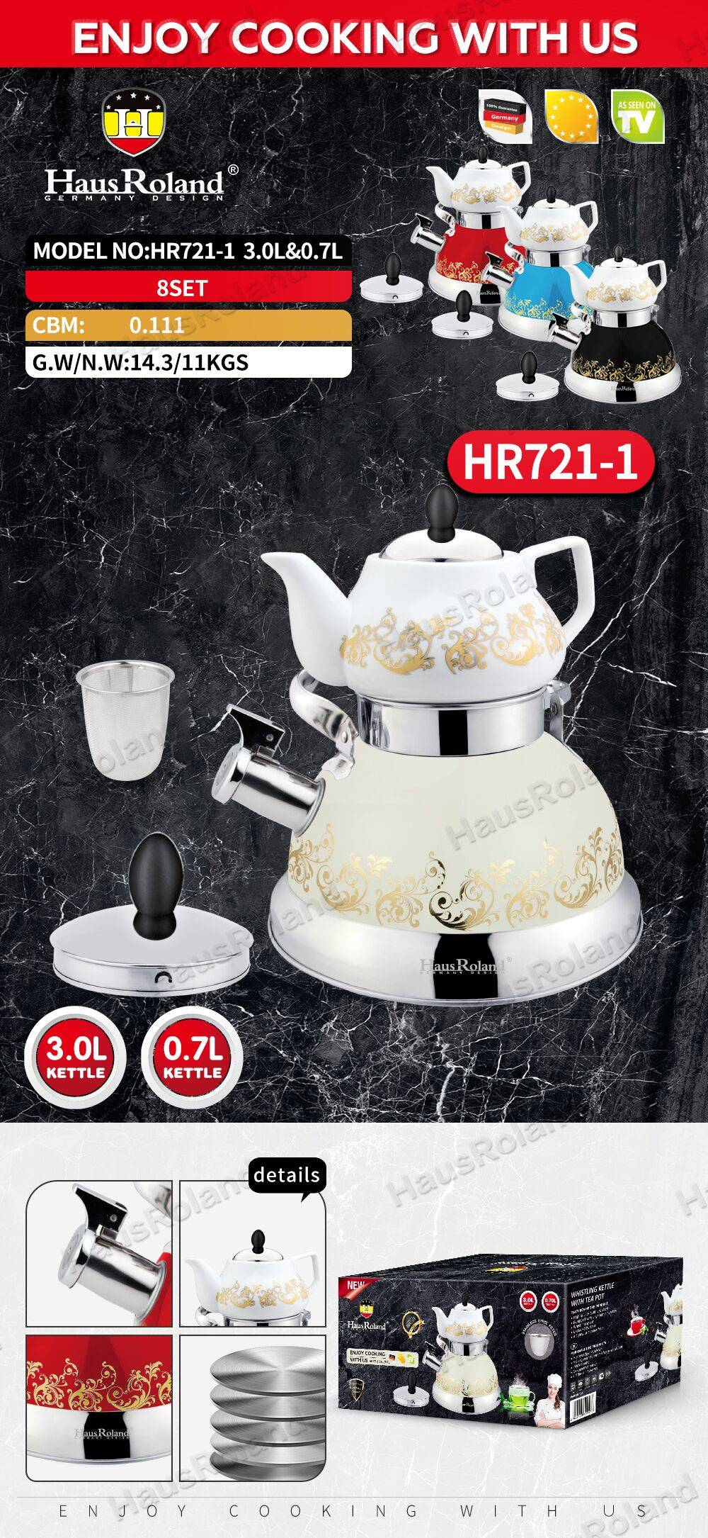 壶身:不锈钢201,0.4mm,带logo 底部:0.5mm铝+1.5mm铁+0.5mm铝,430半包底,有底唛,内底镜光 外部处理:上喷漆+贴金花,下镜光 内部处理:砂光 盖子:不锈钢盖 配件:不锈钢钢管+尼龙手柄