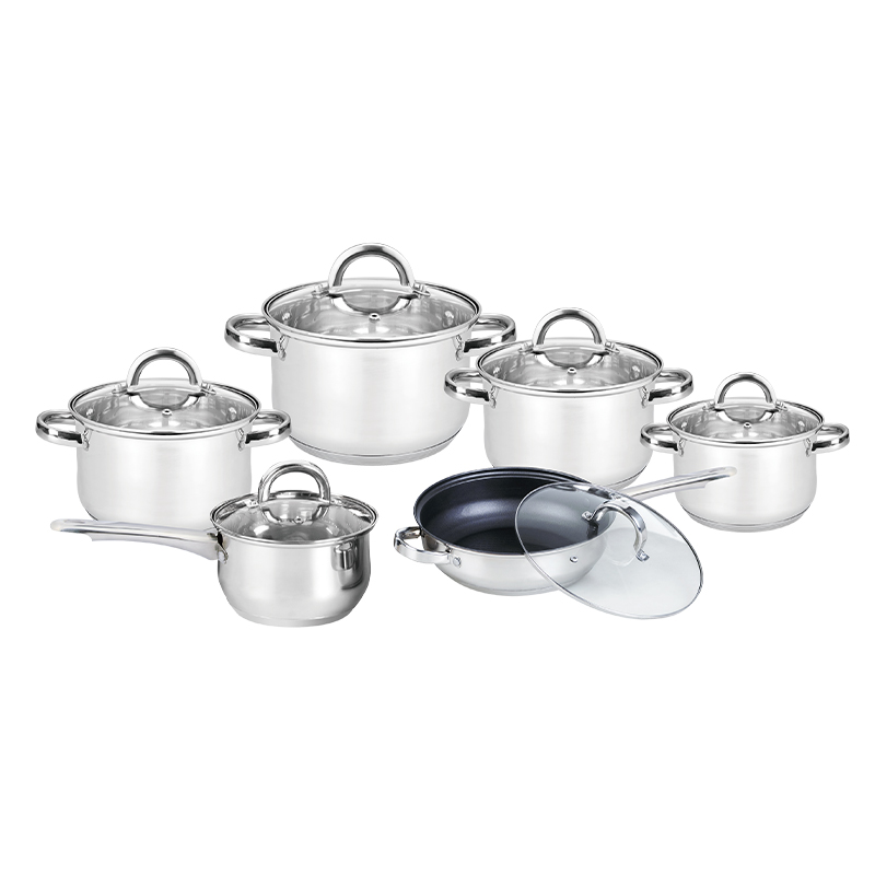 类型:12件套不锈钢套锅 材料:不锈钢 认证:LFGB,CIQ,SGS 产地:中国广东 型号:GS-01219-12PC-3(HR101-2) 尺寸:16/18/20/24cm 盖子:玻璃盖 底部:复底 起订量:1200套