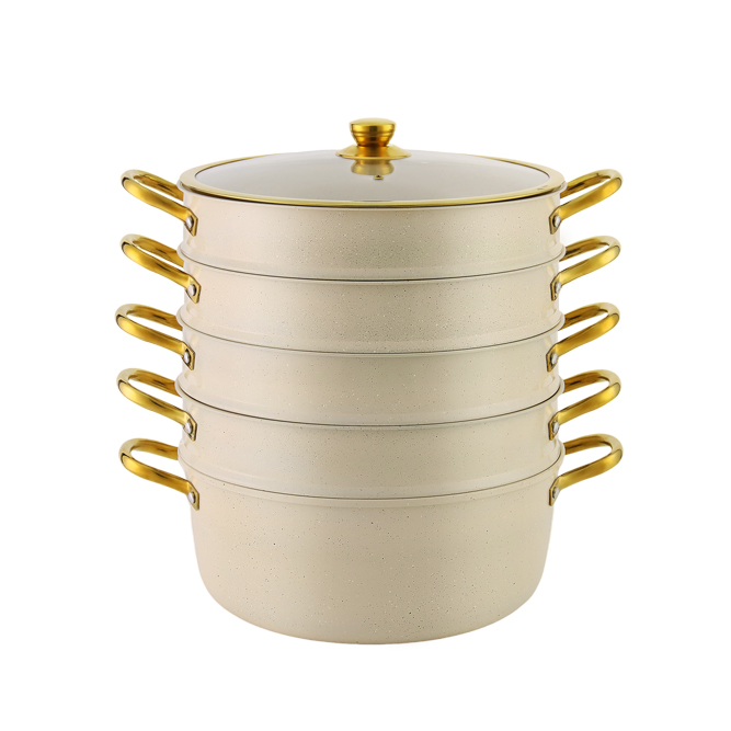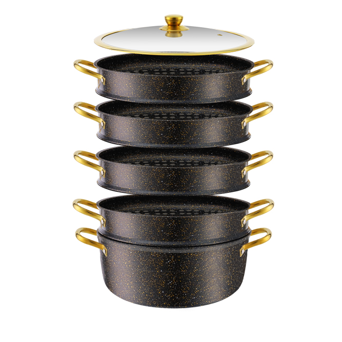 类型:5层不锈钢蒸笼套锅 材料:不锈钢 认证:LFGB,CIQ,SGS 产地:中国广东 型号:GS-01217-5ST-18PC(HR170-1) 尺寸:28×14/30×15/32x16cm 盖子:玻璃盖 底部:复底 起订量:1200套