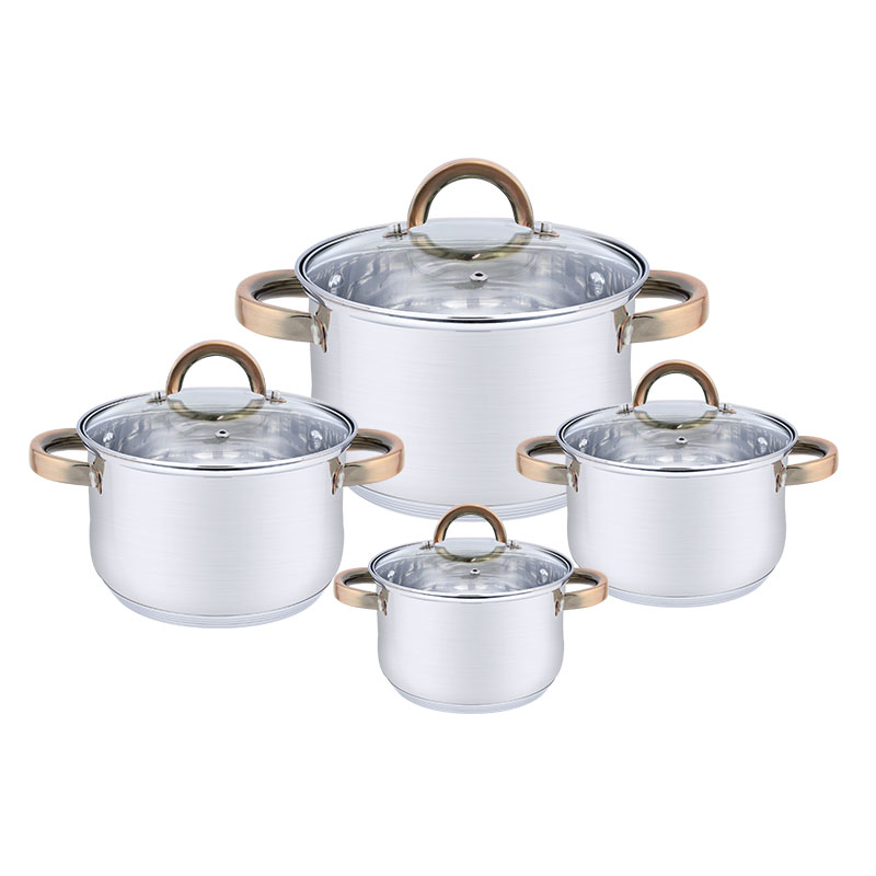 类型:8件套不锈钢套锅 材料:不锈钢 认证:LFGB,CIQ,SGS 产地:中国广东 型号:GS-01219-8PC-1C(HR133-2) 尺寸:16/18/20/24cm 盖子:玻璃盖 底部:复底 起订量:1200套