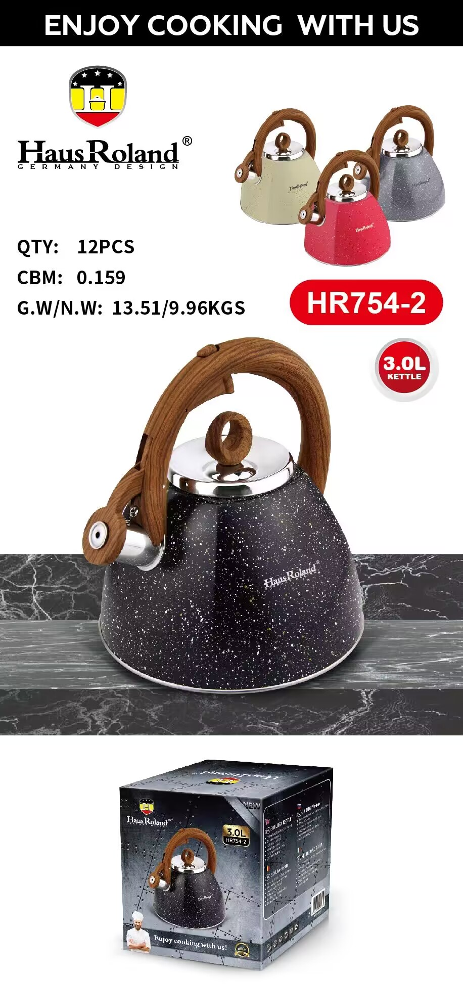 壶身:不锈钢201,0.5mm,带logo 底部:0.5mm铝片+1.5mm铁片+0.5mm 铝片,430大包底,有底唛 外部处理:喷漆撒点 内部处理:砂光,内底镜光 盖子:不锈钢盖子 配件:尼龙手柄和盖滴喷木纹漆 产品净重:950g以上