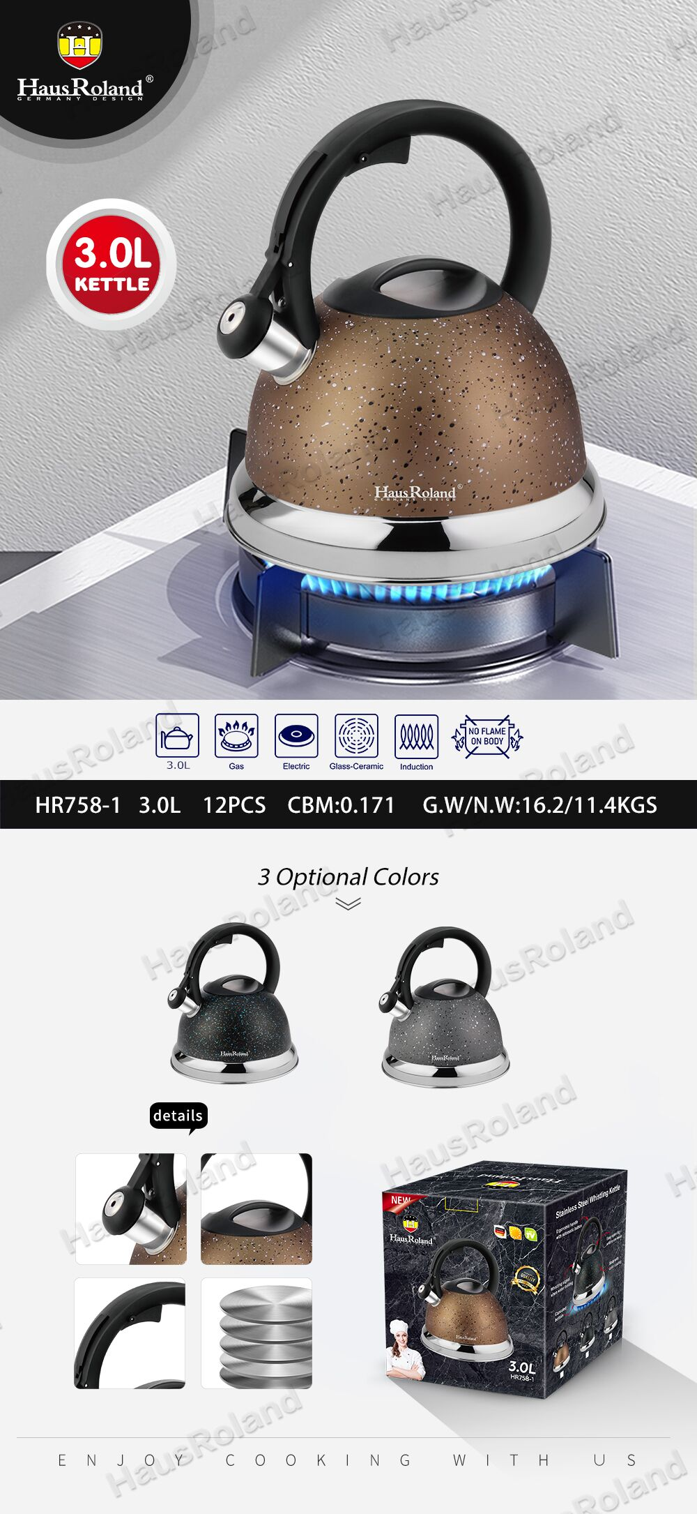壶身:不锈钢201,0.4mm,高壶身 底部:0.5mm铝+1.5mm铁+0.5mm铝,430包底 外部处理:上身喷色撒点,下身镜光(高森提供喷漆) 内部处理:砂光 盖子:不锈钢盖 配件:尼龙柄 产品净重:900G